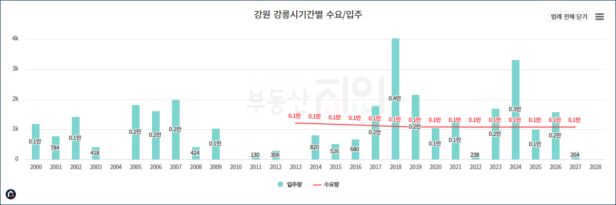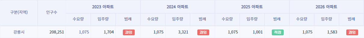 강릉시는 최근 몇 년간 다수의 신규 아파트 단지가 공급되었으며, 이는 주택 공급 과잉을 초래했습니다.