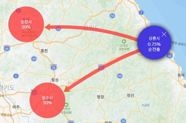 아래 그림을 보시면 과거 1년간 일자리가 많은 원주시 및 춘천시로의 유출 된것을 나타내고 있습니다.