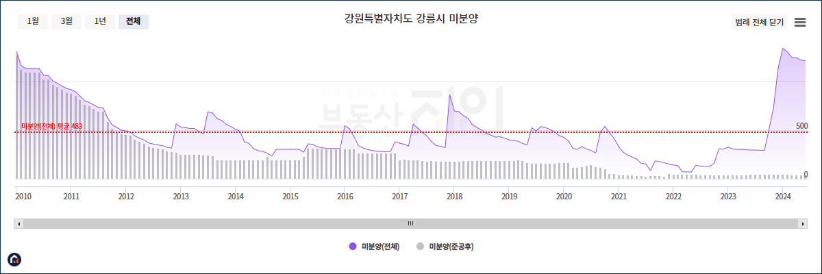강릉시의 미분양 아파트 물량은 최근 크게 증가했습니다.