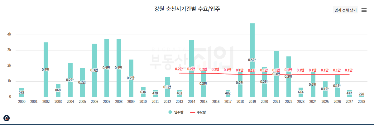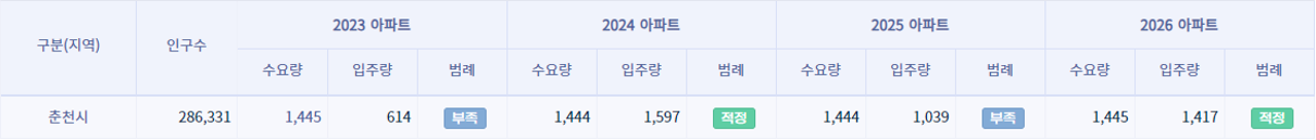 둘째, 2023년부터는 춘천시의 입주 물량이 줄어들면서 추가적인 인구 유입이 둔화된것으로 보입니다.