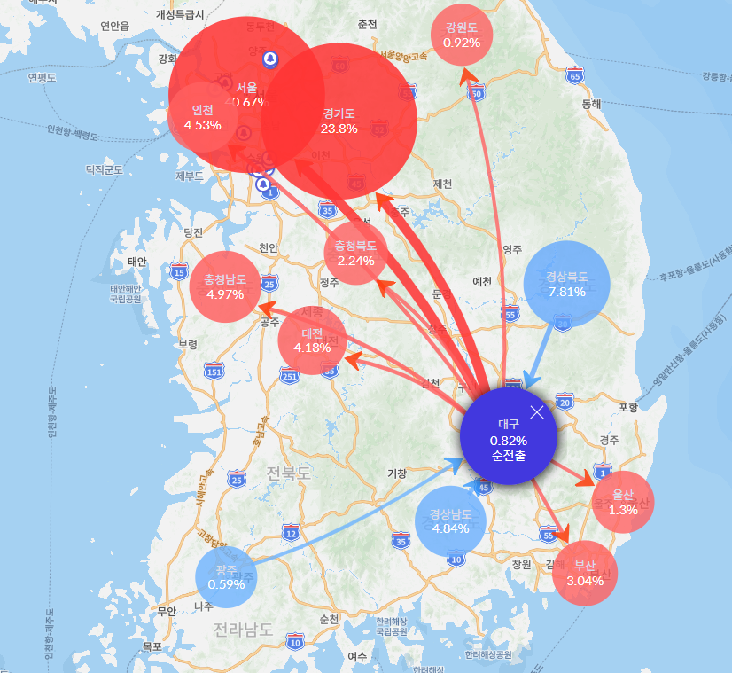 최근 1년간 대구 인구 이동 비율을 보면 서울, 경기, 인천으로 이동하는 인구가 거의 70%가까이 되는 것을 알 수 있습니다.