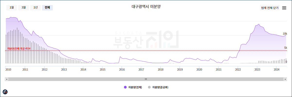 위에서 설명한 바와 같이 대구광역시 미분양 물량은 최근 2023년을 정점으로 지금까지도 상당 물량이 있는 상황입니다.