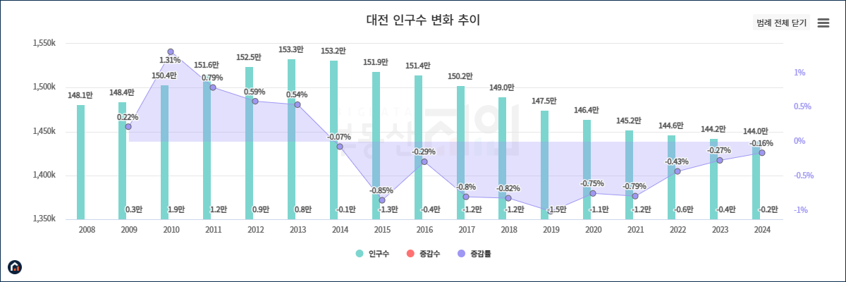 그러나 인근의 세종시의 성장과 더불어 일자리와 교육 환경, 주거환경에 대한 수요가 세종 신도시 쪽으로 몰리면서 대전 인구는 점점 감소하고 있습니다.