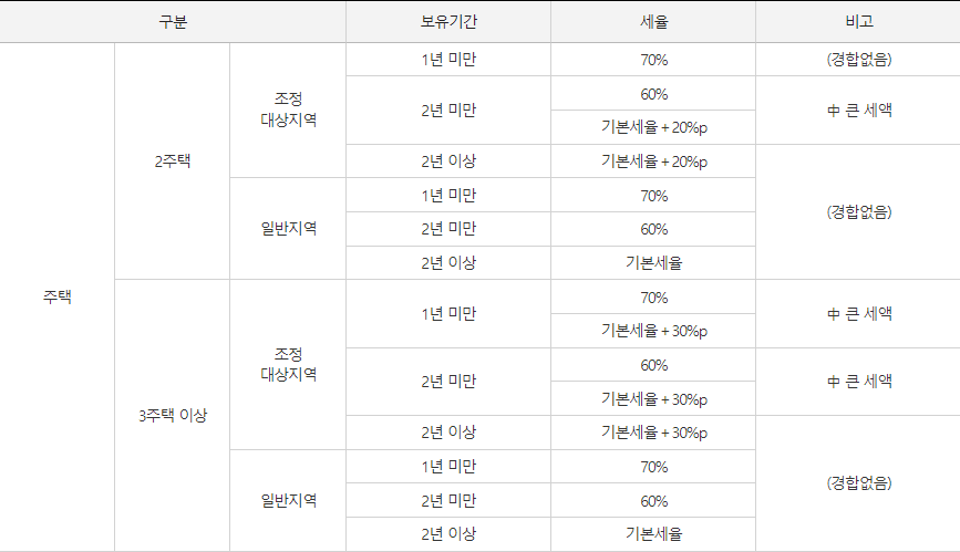 비조정대상지역의 경우, 2년이상 보유시 다주택자에 대한 추가 세율이 없으며, 기본 세율만 적용됩니다.