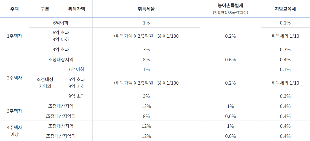 취득세율은 주택 보유 수, 취득 지역(조정대상지역), 취득 가격에 따라 다르게 적용됩니다.