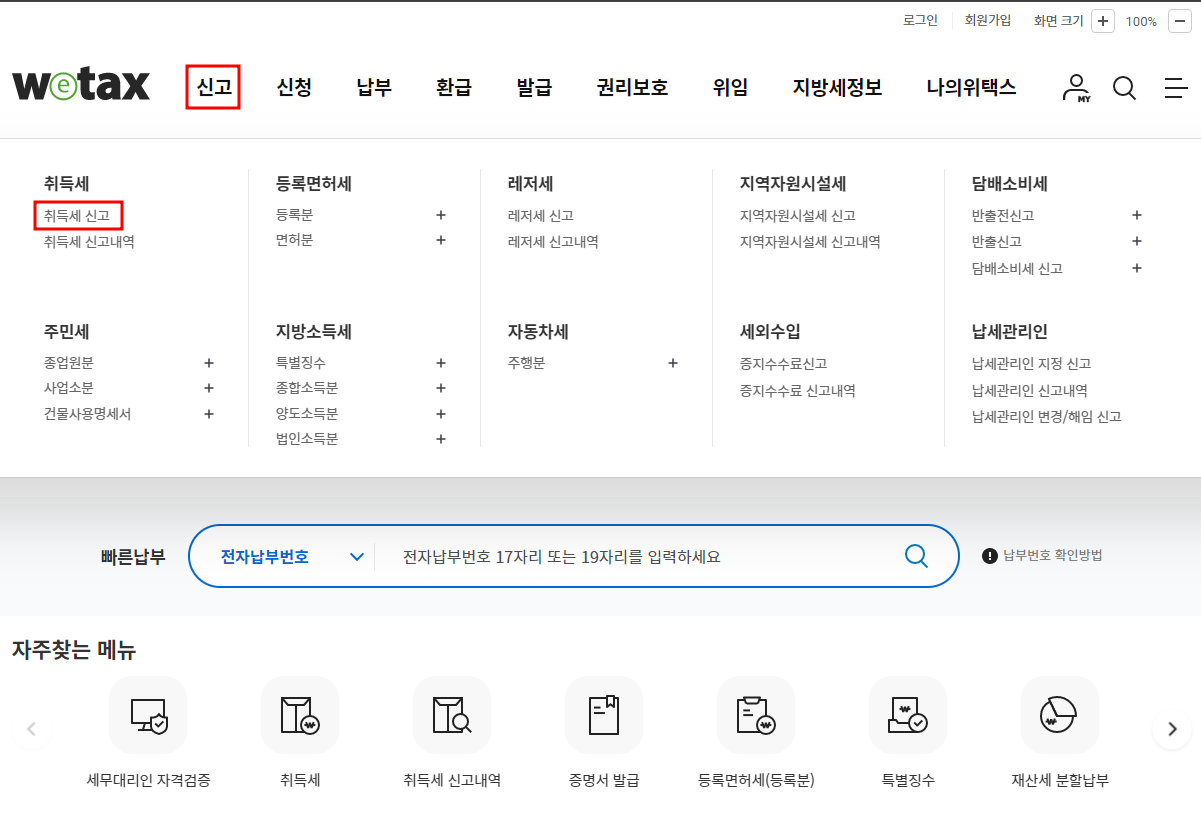 위택스 사이트 취득세 신고하기