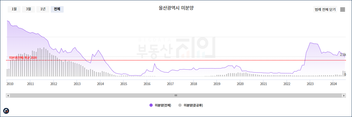 울산광역시 미분양 물량 현황은 2023년 이후 계속해서 이어져 오는 것으로 보아, 이는 전체적인 부동산 시장 침체 현상에 의한 물량이라고 보여집니다.