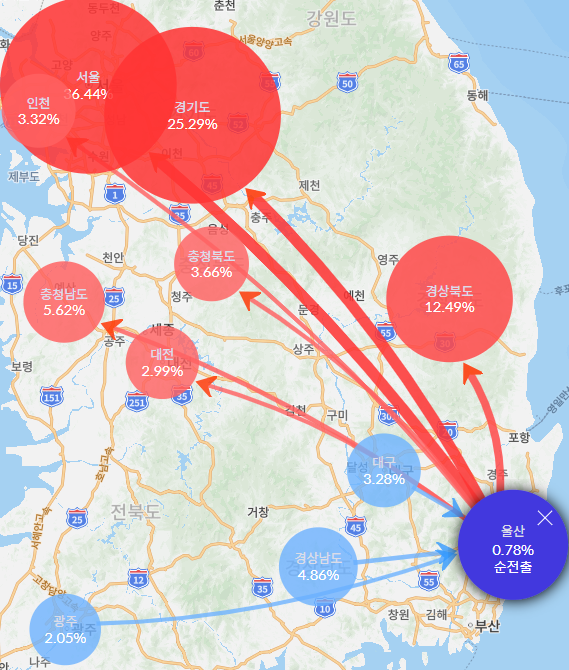 아래는 울산시의 최근 1년간 인구 이동 비율을 보여줍니다.