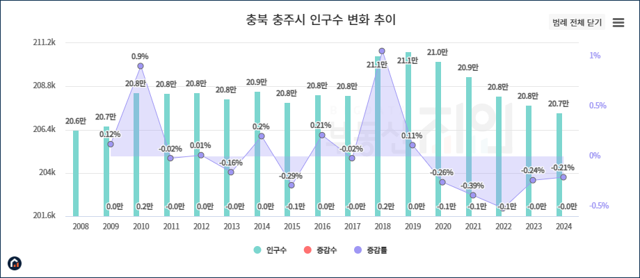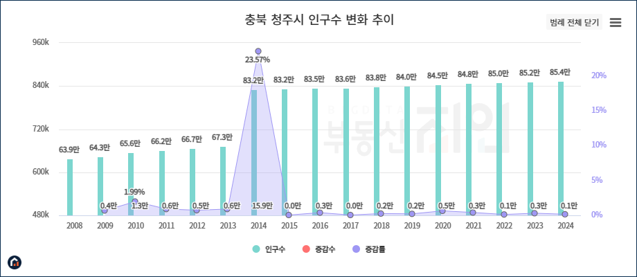 청주시는 여전히 인구 유입이 지속되고 있으며, 이에 따라 입주 물량도 계속해서 있지만, 인구 증가율 둔화와 공급 과잉에 대한 우려도 보이는 편입니다.